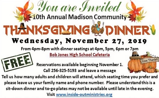 Inside-Out will host the seventh annual Madison Community Thanksgiving Dinner in the cafeteria at Bob Jones High School. The meal is free.